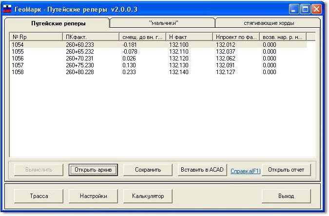 Первая возможность: Вычисления параметров путейских реперов (таких, как фактический пикет репера, смещение до внутренней грани ближайшего рельса, фактическая отметка репера, проектная отметка репера на фактическом пикете, возвышение наружного рельса над внутренним).